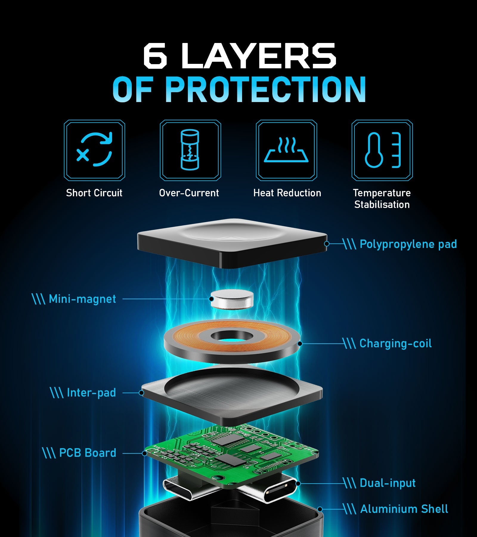 Built-in overcharge, overheating, and short-circuit protection