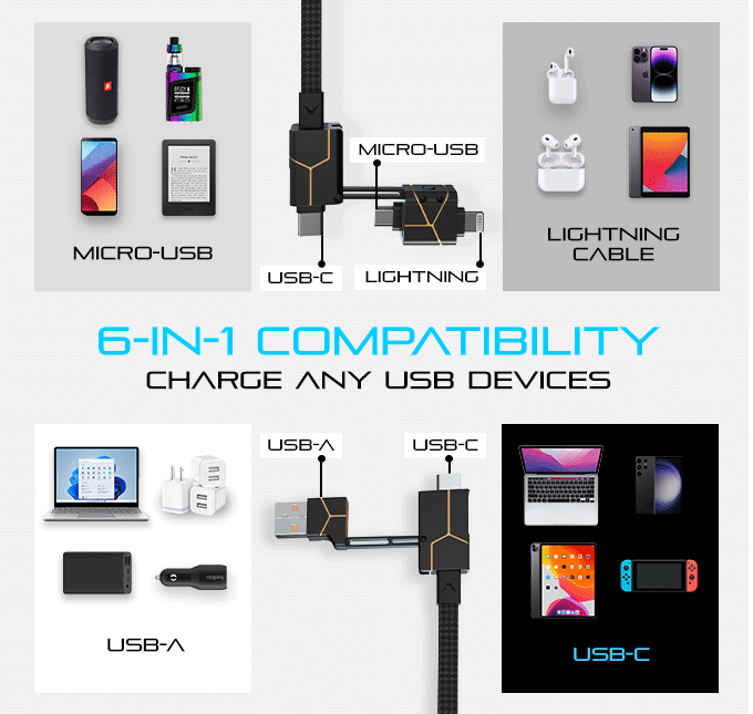 • [6-in-1 Universal Compatibility] - Features Lightning (iPhone), USB-C, and Micro-USB connectors. Capable of fast charging a wide range of electronic devices.