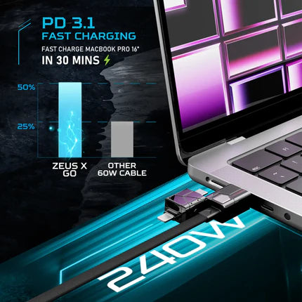 Zeus-X GO Ultra allows USB-C to USB-C ultra fast charging up to 240W and iPhone fast charging up to 30W. It even fast charges laptop and other devices.